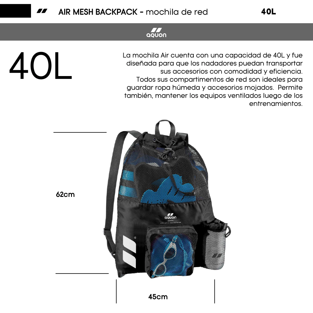 La mochila de red Air, con una capacidad de 40 litros, fue diseñada exclusivamente para nadadores con el fin de transportar sus accesorios con comodidad y eficiencia.