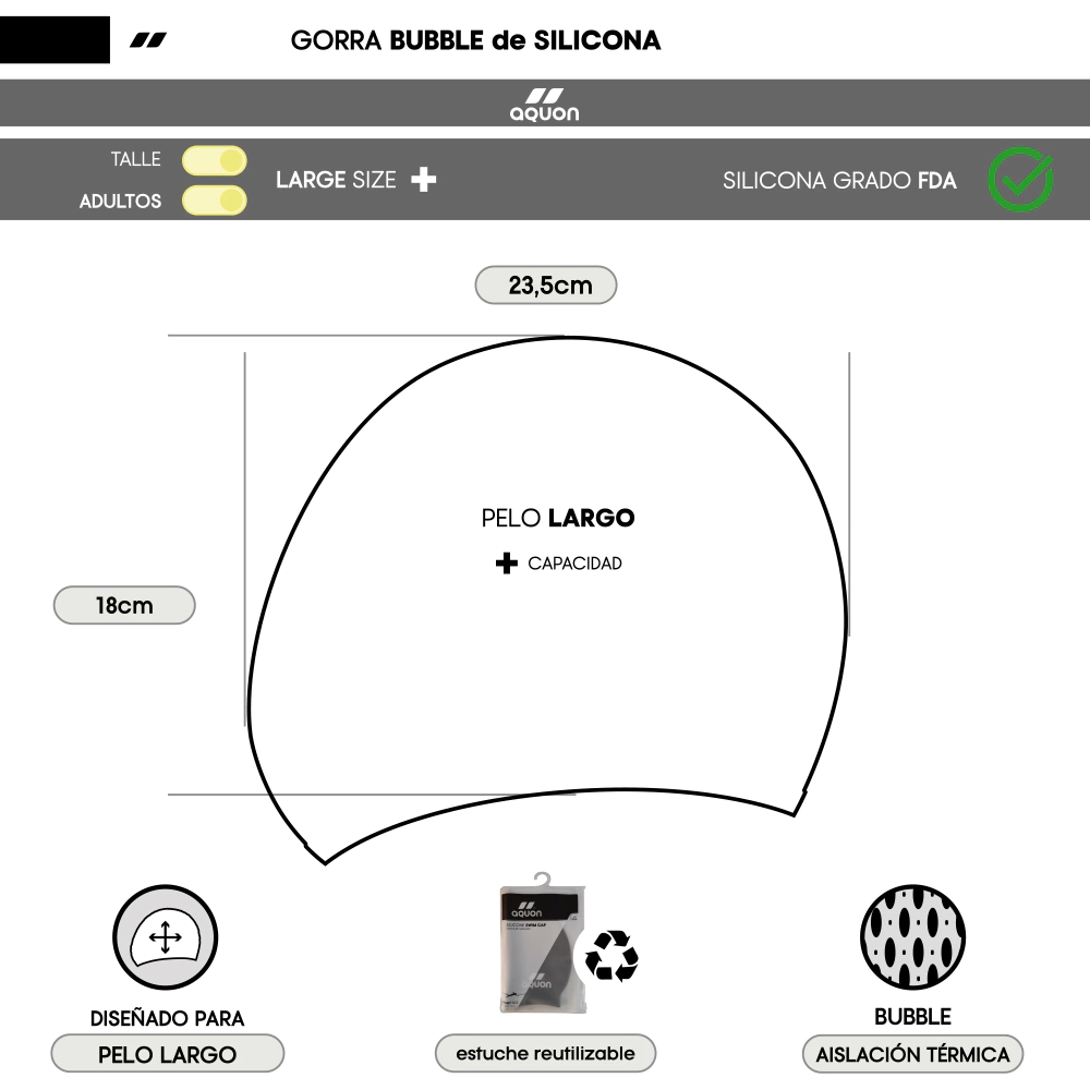 La gorra para natación Bubble de Aquon está fabricada 100% con silicona suave de alta calidad. El material es resistente, y no se rompe ni se deforma, incluso después de muchos usos.